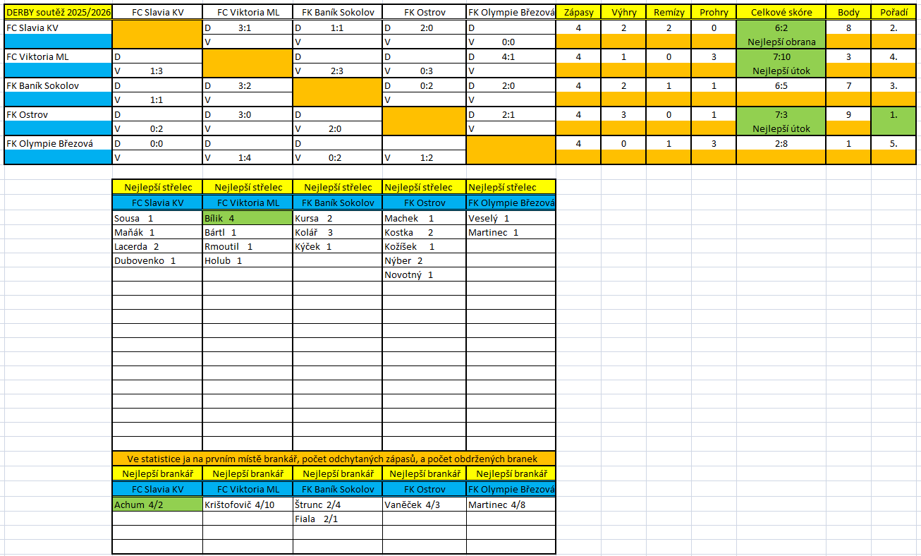 Podzimní část Derby soutěž 2025/2026 skončila, a tak se prozatím můžeme pochlubit celkovým druhým místem, nejlepší obranou a nejlepším brankářem. Je škoda, že se nám v posledních dvou derby utkáních nepodařilo výsledkově přeskočit první FK Ostrov, ale zdaleka není nic rozhodnuto. Našim borcům děkujeme, protože ze čtyř podzimních derby utkání jsme ani jednou neprohráli.
